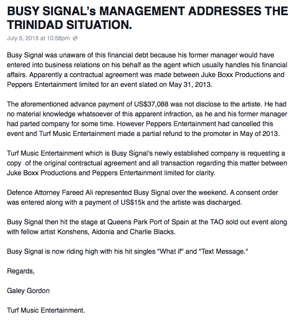 Jamaica’s Busy Signal appeared in court just moments prior to performing at TAO on Saturday. He was accused of a breach of contract. The matter has however been addressed.